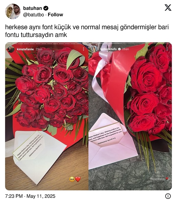 Galatasaray, Anneler Günü için futbolcularının eşlerine çiçek göndermiş, yıldız isimlerin hayat arkadaşları da kulüplerinin ikramını ve duygusal bildirisini toplumsal medya hesaplarından paylaşmıştı. Galatasaray’ın bu jesti sonrasında Icardi’nin eski eşi Wanda Nara da kıskançlık krizine girmiş olmalı ki boş durmadı, hareketiyle toplumsal medyada lisanlara düştü.