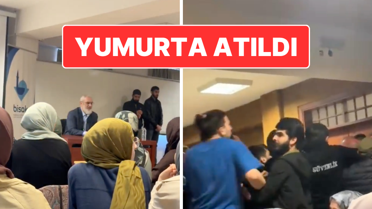 Bazı üniversite öğrencileri tarafından protesto edilen Nureddin Yıldız’a yumurta atıldı. Protestoyu yapan kişi salondan darp edilerek çıkarıldı.