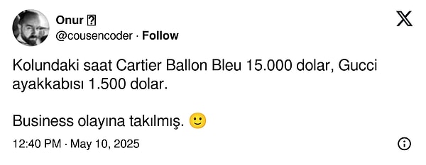 Business uçmayı tercih edenlere ‘savurgan’ etiketi yapıştırıp Business konseptini çok saçma bulduğunu belirten Alaton’un üstündeki kıyafet ve aksesuarlar göz önünde bulundurulduğunda lisanlara düşmesi de kaçınılmaz oldu. Buyurun, ayrıntılara birlikte bakalım!