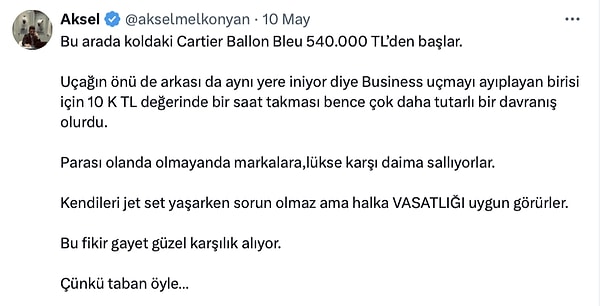‘Business’la uçmayı ayıplıyorum yani sahiden ayıplıyorum zira uçağın biliyorsun önü de gerisi da birebir yere iniyor. Yani onun için büyük bir savurganlık üzere güya, mecbur değilsin. Artık mesela birkaç saat sonra tarım için toplantımız var, Denizli’ye uçacağım. Natürel ki iktisatta uçacağım. Yani ne alakası var? Niçin business’ta oturayım? Anlamsız geliyor anlamsız. Manasız. Savurganlık… Gereksinimim yok’ açıklamasında bulundu.