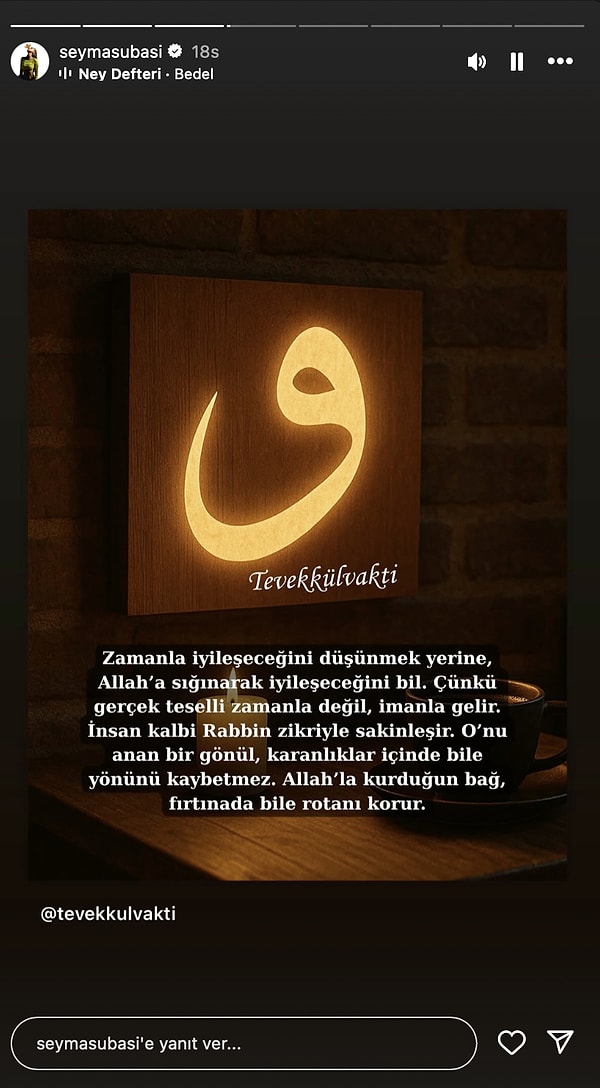 Gece gece derin kanılara dalan Şeyma Subaşı, @tevekkulvakti hesabın paylaştığı sözleri Instagram öyküsüne ekledi.