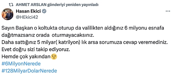 Ahmet Arslan ayrıyeten Hasan Ekici’nin Konya’nın AKP’li Büyükşehir Belediye Başkanı İbrahim Altay’ı eleştirdiği paylaşımı tekrar deverana soktu.