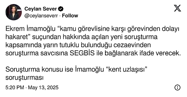 Habertürk’ten gazeteci Ceylan Sever, İmamoğlu’nun soruşturma açılan tabirini paylaştı.