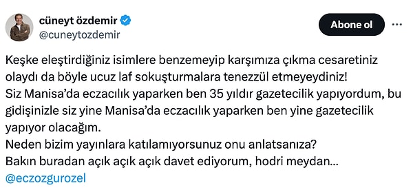 Sosyal medya hesabından Özgür Özel’i etiketleyerek açıklama yapan Cüneyt Özdemir “Keşke eleştirdiğiniz isimlere benzemeyip karşımıza çıkma cüretiniz olaydı da bu türlü ucuz laf sokuşturmalara tenezzül etmeyeydiniz! Siz Manisa’da eczacılık yaparken ben 35 yıldır gazetecilik yapıyordum, bu gidişinizle siz yeniden Manisa’da eczacılık yaparken ben yeniden gazetecilik yapıyor olacağım. Neden bizim yayınlara katılamıyorsunuz onu anlatsanıza? Bakın buradan açık açık açık davet ediyorum, hodri meydan…” dedi.