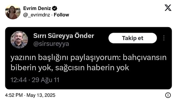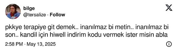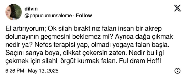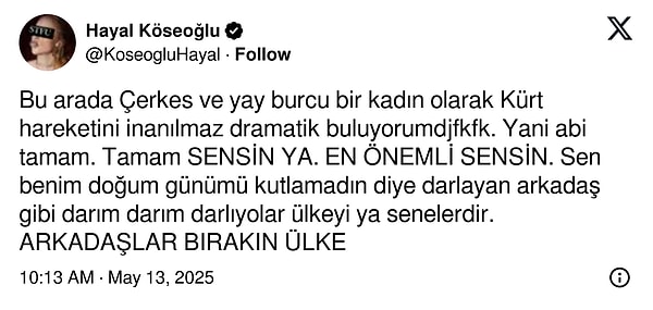 Başarılı oyuncu son olarak PKK’nın silah bırakması ve örgütü lağvetmesiyle ilgili bir paylaşımda bulundu. “Çerkes ve yay burcu bir kadın” olarak başlayan paylaşım Twitter’da en çok konuşulan mevzulardan oldu.