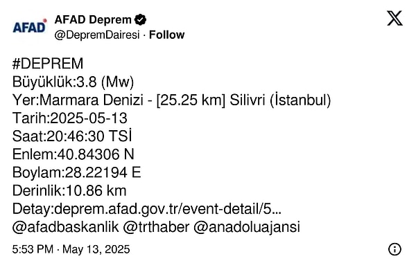 AFAD, Silivri açıklarında 23 Nisan’daki 6.2 büyüklüğündeki sarsıntıyla tıpkı bölgede 3.8 büyüklüğünde sarsıntı meydana geldiğini açıkladı.
