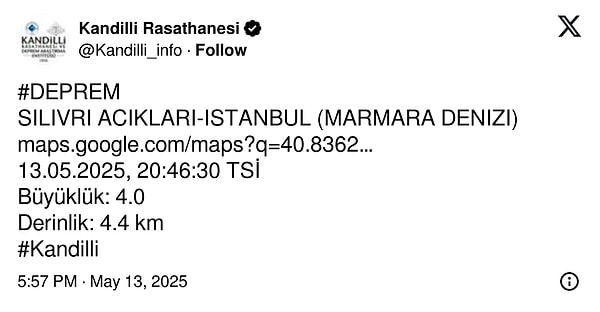 Kandilli Rasathanesi ise yaşanan zelzelenin büyüklüğünü 4.0 olarak duyurdu.