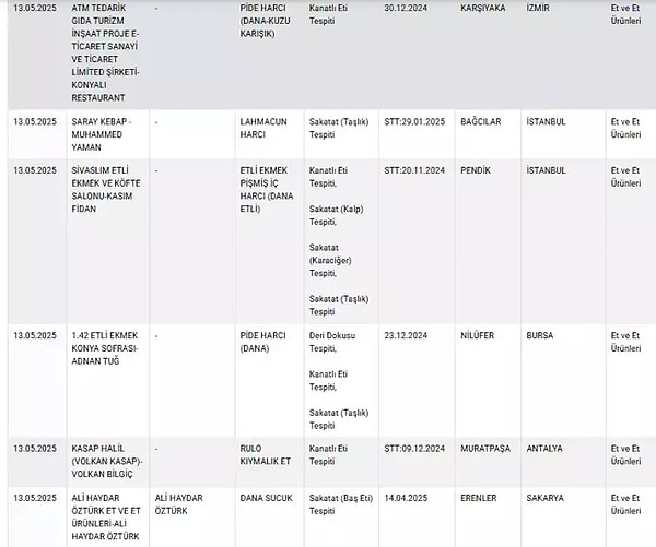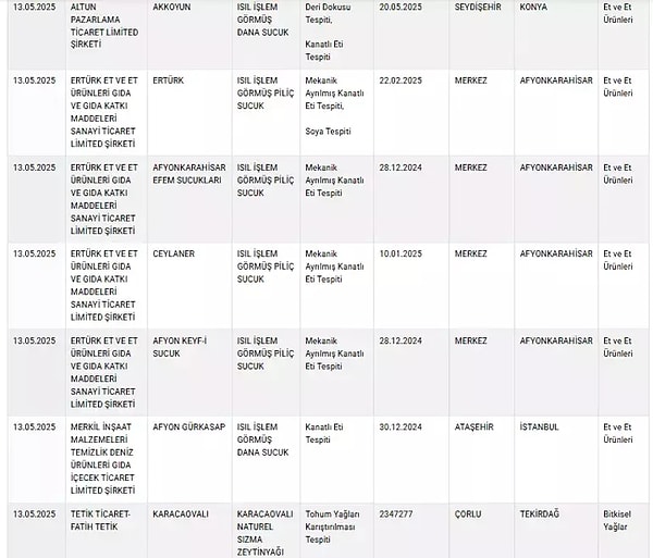 13 Mayıs tarihli değişiklikte listeye çok sayıda zeytinyağı, tereyağı ve peynir üreticisi dahil edilirken, listenin en dikkat çeken kısmı ise mevzuata ters üretim yaptığı tespit edilen sucuk markaları oldu.