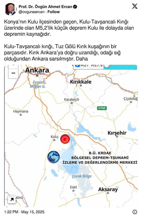 Konya’nın Kulu ilçesinde saat 15.46’da 5.2 büyüklüğünde zelzele meydana geldi. Yerin 6.9 kilometre derinliğinde meydana gelen zelzele başta Ankara olmak üzere etraf vilayetlerde şiddetli biçimde hissedildi. Jeofizik Yüksek Mühendisi Prof. Dr. Ahmet Ercan’dan Ankara’dan hissedilen Konya sarsıntısıyla ilgili açıklama geldi.