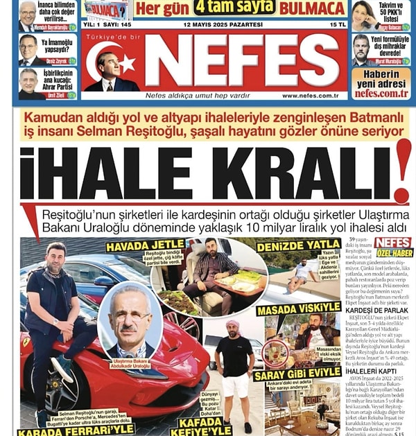 Nefes gazetesi 12 Mayıs Pazartesi günü iş insanı Selman Reşitoğlu’nu “İhale Kralı” başlığıylaa manşetine taşımıştı. Reşitoğlu’nun kamudan milyar liralık ihaleler alarak jet süratiyle zenginleştiği tez edilen haberde Instagram hesabından paylaştığı lüks hayatına dair fotoğraflar da yer almıştı.