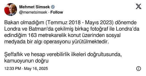 ‘Bakan olmadığım (Temmuz 2018 – Mayıs 2023) devirde Londra ve Batman’da çekilmiş birkaç fotoğraf ile Londra’da edindiğim 163 metrekarelik konut üzerinden toplumsal medyada bir algı operasyonu yürütülmektedir.
