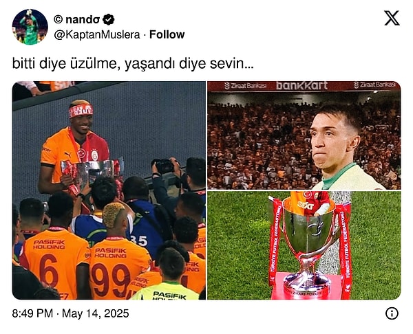 Lucas Torrerira, zafer sonunda toplumsal medya hesabından yaptığı paylaşımda Muslera için ‘Seninle her an özel kardeşim. Her şey için teşekkürler. Ve sonuncusu için gidiyoruz!’  ifadelerini kullandı. Torreira’nın paylaşımı veda olarak yorumlanırken Icardi de Muslera’nın gönderisine ‘bir yıl daha’ halinde yorum attı.