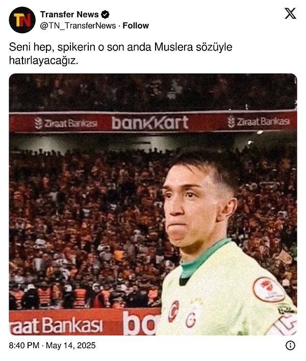 Galatasaray taraftarı, toplumsal medyada yıllardır kalelerini koruyan Uruguaylı oyuncuları Fernando Muslera’ya veda etmeye başladı. Sarı-kırmızılılar, 38 yaşındaki file bekçisinin yeni dönemde olmayacağına dair paylaşımlarda bulundu. Arka arda teşekkürler geldi.
