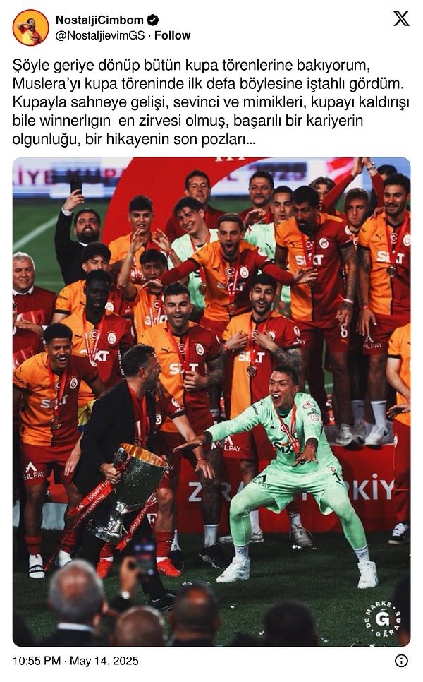 2011 yazından bu yana Galatasaray formasıyla saha çıkan deneyimli kaleci, bu başarısıyla Türk futbol tarihinin en çok kupa kazanan oyuncusu olmaya da çok yaklaştı. Bülent Korkmaz’ı yakalayan Muslera, Süper Lig şampiyonluğu da elde ederse 19 kupa ile Türk futbolunun doruğuna çıkacak.