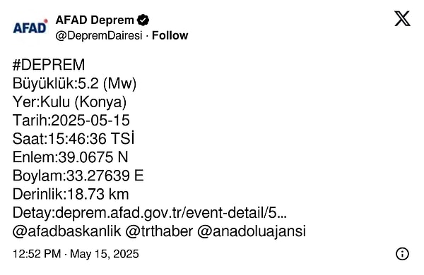 AFAD, Konya’nın Kulu ilçesinde 5.2 büyüklüğünde zelzele meydana geldiğini açıkladı. Sarsıntı Ankara ve etraf vilayetlerden de hissedildi.