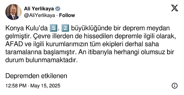 Konya Kulu’da 5.2 büyüklüğünde bir sarsıntı meydan gelmiştir. Etraf vilayetlerden de hissedilen zelzeleyle ilgili olarak, AFAD ve ilgili kurumlarımızın tüm grupları derhal saha taramalarına başlamıştır. An prestijiyle rastgele olumsuz bir durum bulunmamaktadır.