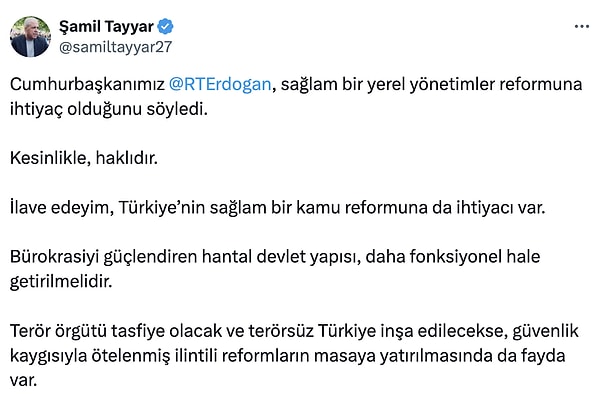Şamil Tayyar lokal idareler konusunda ilçe, belde belediyelerinin kaldırılmasını önerdi.