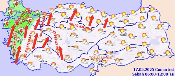 Meteoroloji Genel Müdürlüğü (MGM), 17 Mayıs Cumartesi günü hava durumunu paylaştı. 15 kente sarı kodlu ikaz verildi. Sarı kodlu ikazın verildiği kentler şöyle: