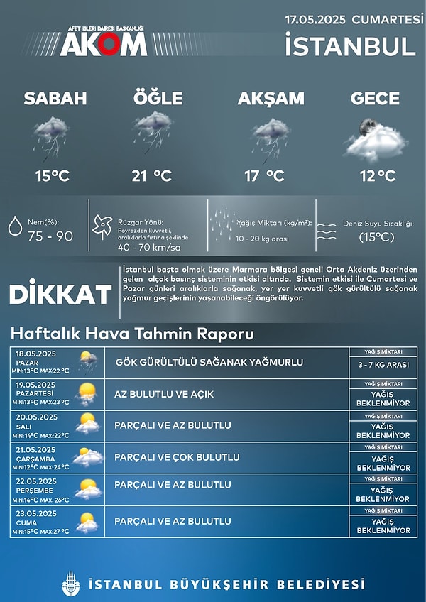 İstanbul Büyükşehir Belediyesi Afet İşleri Dairesi Başkanlığı (AKOM) hava durumuna dair uyardı.