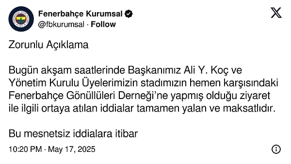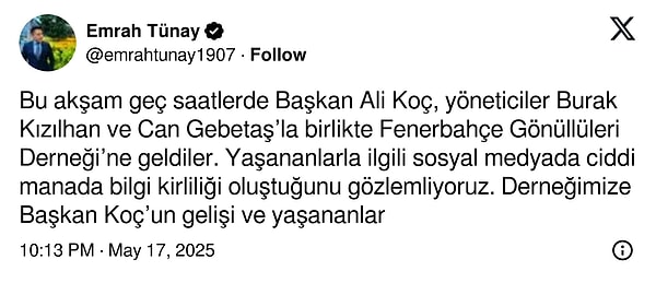 Bu akşam geç saatlerde Lider Ali Koç, yöneticiler Burak Kızılhan ve Can Gebetaş’la birlikte Fenerbahçe Gönüllüleri Derneği’ne geldiler. Yaşananlarla ilgili toplumsal medyada önemli manada bilgi kirliliği oluştuğunu gözlemliyoruz. Derneğimize Lider Koç’un gelişi ve yaşananlar konusunda biz gerekli açıklamaları gün içinde yapacağız. Manipülasyonlara ve algı idaresine prestij edilmemesini rica ederiz.