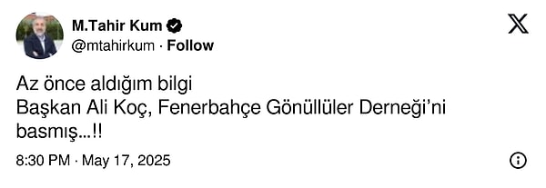 Fenerbahçe, gazeteci Tahir Kum’un canlı yayında lisana getirdiği ve toplumsal medya hesabından paylaştığı, sarı-lacivertli kulübün başkanı Ali Koç’un dernek bastığı istikametindeki iddiayı yalanladı.