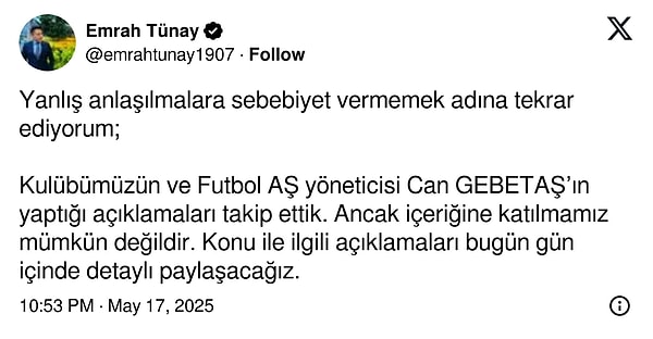 Kulübümüzün ve Futbol AŞ yöneticisi Can GEBETAŞ’ın yaptığı açıklamaları takip ettik. Fakat içeriğine katılmamız mümkün değildir. Mevzu ile ilgili açıklamaları bugün gün içinde ayrıntılı paylaşacağız.’