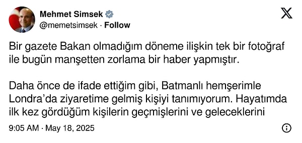 Bakan Mehmet Şimşek bu sefer ise Gürkan Dölekli ile Londra’daki fotoğrafını manşete taşıyan Sözcü Gazetesi’ne reaksiyon gösterdi.