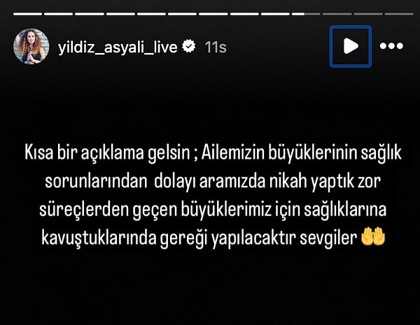 Asyalı, apar topar evlenmelerinin nedenini şu biçimde açıkladı: ‘Ailemizin büyüklerinin sıhhat problemlerinden ötürü ortamızda nikah yaptık. Güç süreçlerden geçen büyüklerimiz için. Sıhhatlerine kavuştuklarında gereği yapılacaktır.’