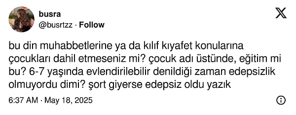 Bu din muhabbetlerine ya da kılıf kıyafet hususlarına çocukları dahil etmeseniz mi? Çocuk ismi üstünde, eğitim mi bu? 6-7 yaşında evlendirilebilir denildiği vakit edepsizlik olmuyordu değil mi? Şort giyerse edepsiz oldu yazık.