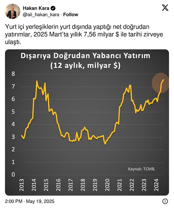 “Yurt içi yerleşiklerin yurt dışında yaptığı net direkt yatırımlar, 2025 Mart’ta yıllık 7,56 milyar dolar ile tarihi tepeye ulaştı.”