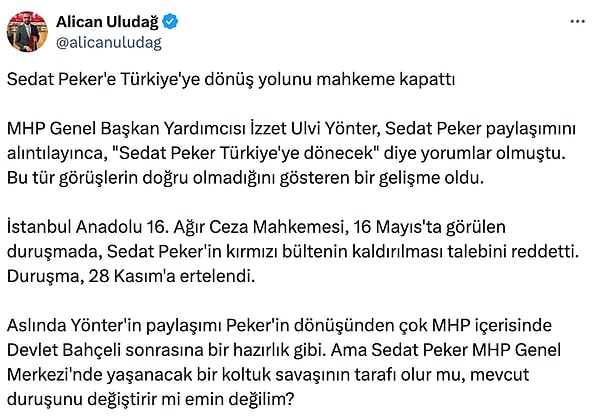Gazeteci Alican Uludağ’ın haberine nazaran; İstanbul Anadolu 16. Ağır Ceza Mahkemesi, 16 Mayıs’ta görülen duruşmada, Sedat Peker’in kırmızı bültenin kaldırılması talebini reddetti. Duruşma, 28 Kasım’a ertelendi.