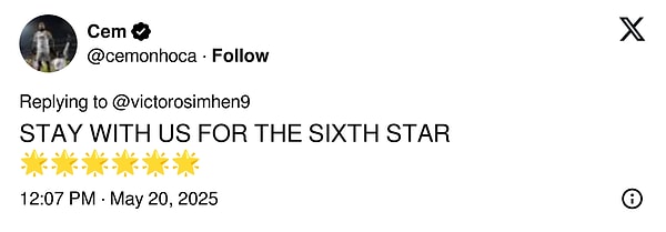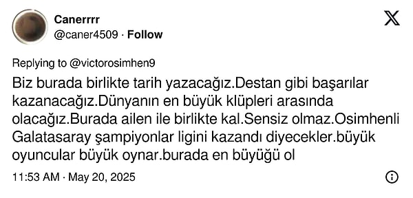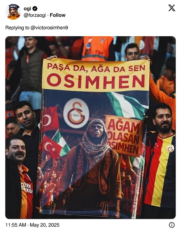Napoli’den kiralık olarak Galatasaray’a katılan Osimhen, kırk yıllık Galatasaraylı üzere gösterdiği performans ve aidiyetle taraftarın sevgilisi oldu. Beşinci yıldızda kıymetli hissesi olan Osimhen’e taraftarlar ‘Bizimle Kal’ kampanyası başlattı ve her paylaşımının altını yorum bombardımanına tutmaya başladı.