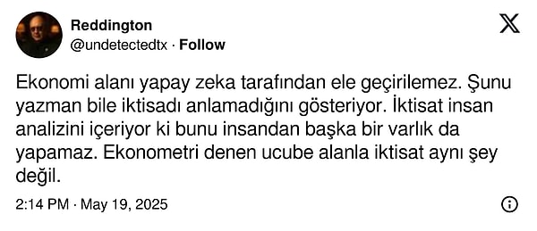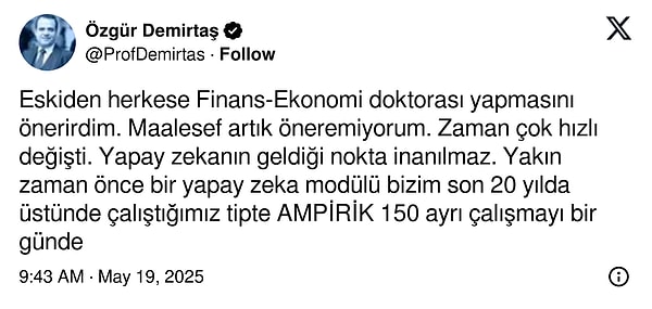 Sosyal medya hesabı X’ten gündeme ve iktisada dair paylaşımlarda bulunan Prof. Dr. Özgür Demirtaş, bu sefer yapay zeka ve mesleklere dair bir paylaşım yaptı. Demirtaş, yapay zekanın yok edeceği meslekleri açıkladı.