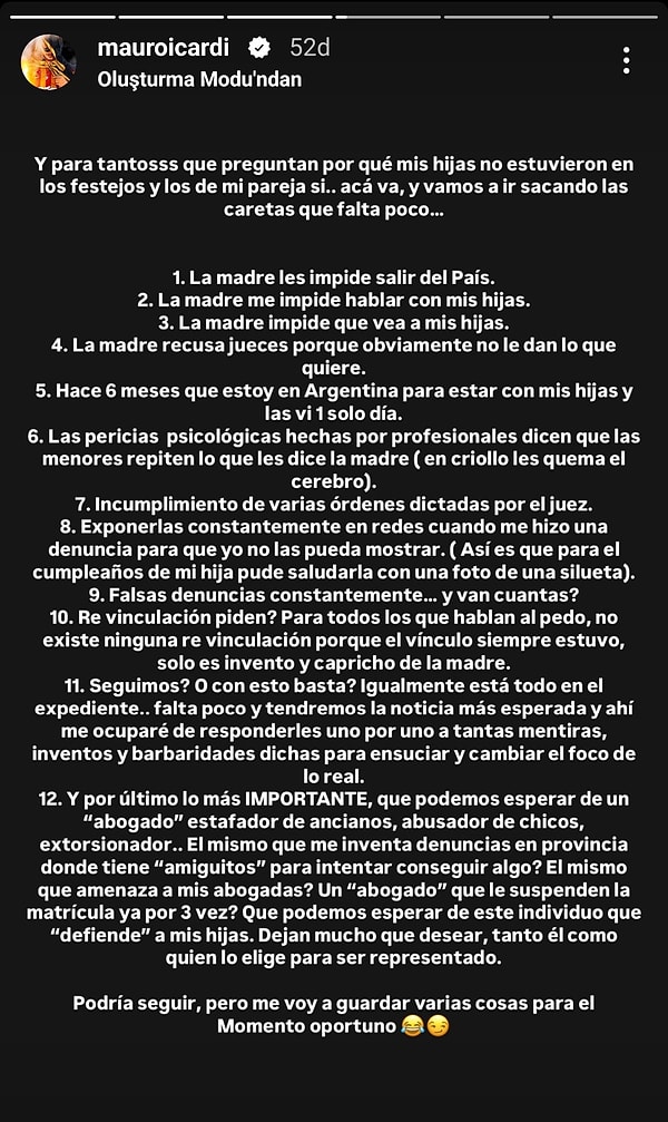 Icardi, eski eşi Wanda Nara’nın kızlarını kendisine göstermediğini belirterek, “Maskelerin düşmesine az kaldı” sözlerini kullandı.