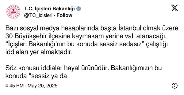 İçişleri Bakanlığı’nın açıklamasında, “Bazı toplumsal medya hesaplarında başta İstanbul olmak üzere 30 Büyükşehir ilçesine kaymakam yerine vali atanacağı, “İçişleri Bakanlığı’nın bu mevzuda sessiz sedasız” çalıştığı argümanları yer almaktadır. Kelam konusu savlar hayal eseridir. Bakanlığımızın bu hususta “sessiz ya da sesli” rastgele bir çalışması yoktur.” tabirleri yer aldı.