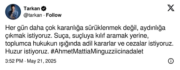 X hesabından paylaştığı tweet’le yaşanılanlara sessiz kalmayan Tarkan, ‘Her gün daha çok karanlığa sürüklenmek değil, aydınlığa çıkmak istiyoruz. Suça, suçluya kılıf aramak yerine, toplumca hukukun ışığında adil kararlar ve cezalar istiyoruz. Huzur istiyoruz.’ tabirlerini kullandı.