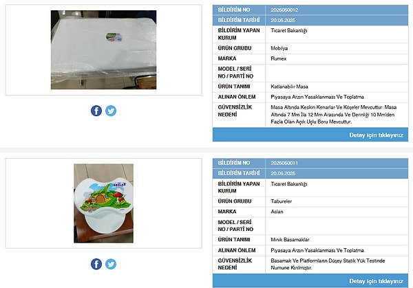 Ticaret Bakanlığı, “Rumex” markasına ait katlanabilir masa eser kümesinde tespit edilen yapısal sıkıntılar nedeniyle eserin piyasadan toplatılmasına karar verdi.
