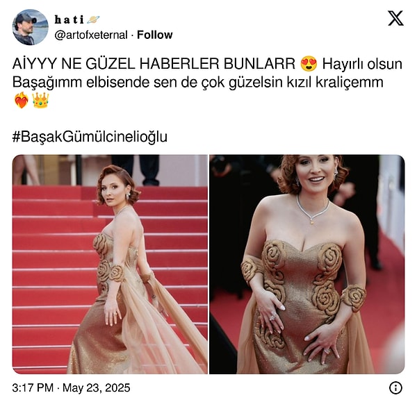 9 Ekim 2022 tarihinde ‘Sen Çal Kapımı’ dizisinde birlikte rol aldığı oyuncu Davet Çıtanak ile hayatını birleştiren Başak Gümülcinelioğlu’ndan Cannes kırmızı halısında bebek sürprizi geldi.