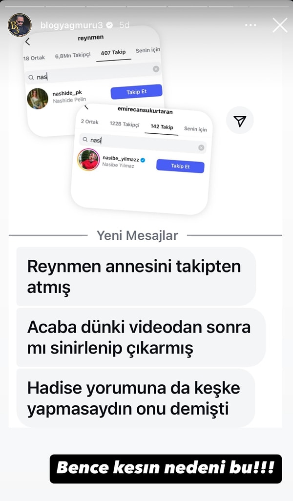 ‘Bir insan para da kazanıyorsa edebiyle kazansın, bu paranın rahmeti olmaz. Bunu asla unutmayın. Haramla kazanılan paradan bir farkı yok. İğrenç ötesi, midem bulandı.’ yorumunda bulunan Reynmen’in annesi Nesibe Yılmaz bu kelamların akabinde gelini Cansu’dan gelen reaksiyonla manşetlere yerleşmişti.
