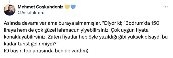 Bodrum Belediye Başkanı Tamer Mandalinci’nin “siz orada lahmacunu satın almıyorsunuz, orada o şahıslarla oturma hürriyete, o çatal bıçağı kullanma hürriyeti, o görüntüde o lüksü yaşama hürriyetini satın alıyorsunuz.” sözleri tartışma yarattı.