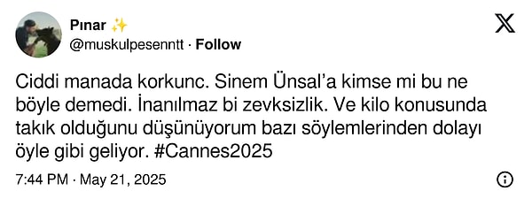 Cannes pozlarının ve elbise dizaynının gündeme oturmasının akabinde Sinem Ünsal’ın fiziği de konuşulur hale geldi.