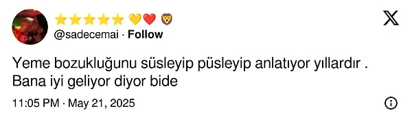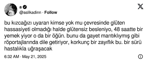 Daha evvel bağırsak rahatsızlığı olduğunu “Bağırsak rahatsızlığım olduğu için mecburen bu biçimde besleniyorum. Yoksa doğal ki pizza ve makarna seviyorum. Fakat süt ve süt eserleri tüketemiyorum. Asıl enteresan olan, 8-9 yaşımdan beri et yemiyorum. Etin tadını bile bilmiyorum” kelamlarıyla aktaran Sinem Ünsal’ın kilosu X’te bir kullanıcının attığı tweetle gündeme geldi.
