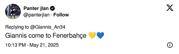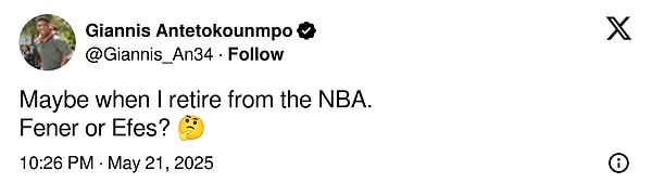 Antetokounmpo, sarı-lacivertli basketbolseverin “Come to Fenerbahçe” paylaşımına “Belki NBA’den emekli olduğum vakit. Fenerbahçe mi, Efes mi?” karşılığını verdi.