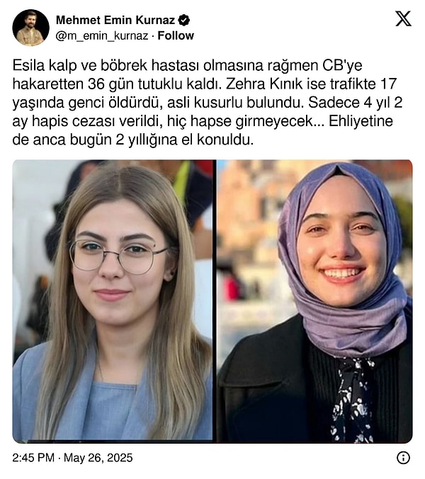 ‘Esila kalp ve böbrek hastası olmasına karşın CB’ye hakaretten 36 gün tutuklu kaldı. Zehra Kınık ise trafikte 17 yaşında genci öldürdü, asli kusurlu bulundu. Yalnızca 4 yıl 2 ay mahpus cezası verildi, hiç mahpusa girmeyecek… Ehliyetine de anca bugün 2 yıllığına el konuldu.’