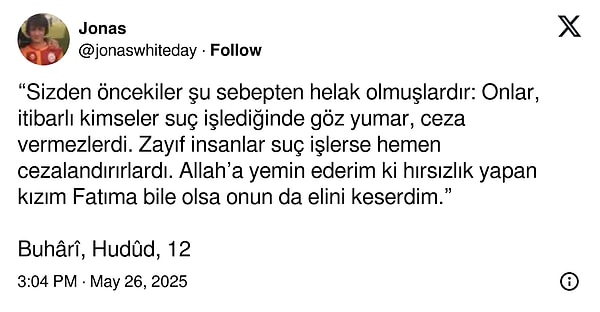 “Sizden evvelkiler şu sebepten helak olmuşlardır: Onlar, prestijli kimseler cürüm işlediğinde göz yumar, ceza vermezlerdi. Zayıf beşerler hata işlerse çabucak cezalandırırlardı. Allah’a yemin ederim ki hırsızlık yapan kızım Fatıma bile olsa onun da elini keserdim.”