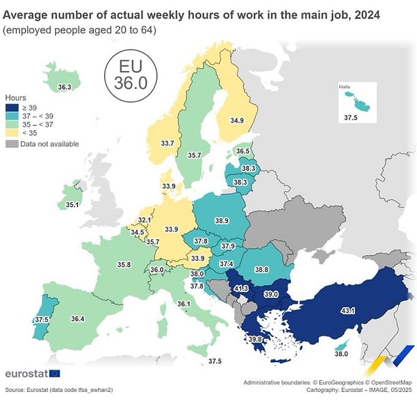 Eurostat’ın yayınladığı haftalık çalışma saatleri bilgileri 👇
