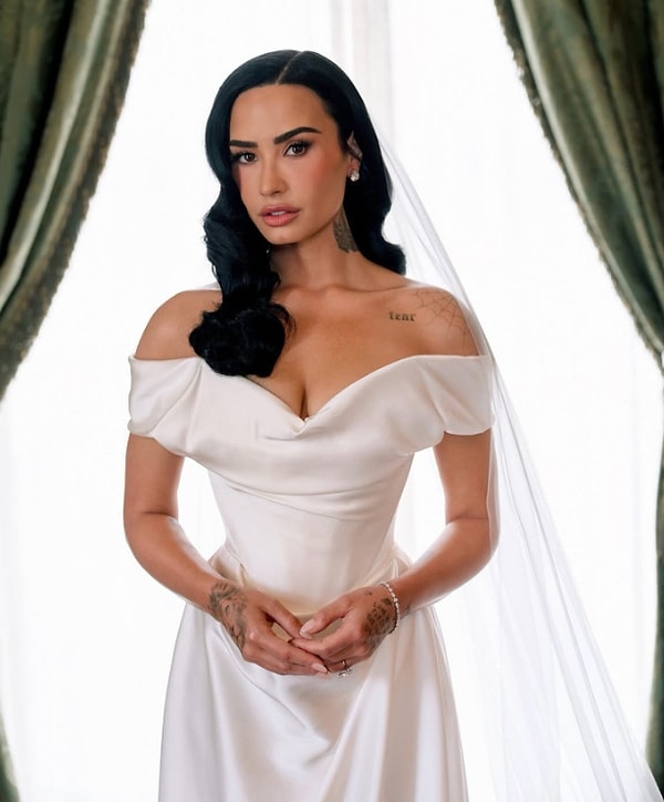 Koridorda yürüyüşü için korse korsajlı ve katedral usulü tül duvaklı özel ‘inci beyazı’ Vivenne Westwood elbisesiyle beyazlar içerisinde süzülen Demi Lovato, ‘Uzun vakittir Vivienne Westwood’un dizaynlarının hayranıyım’ dedi.