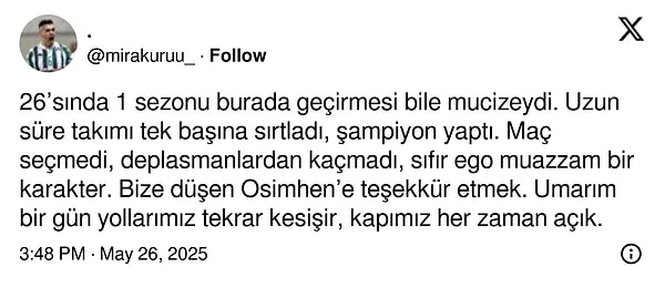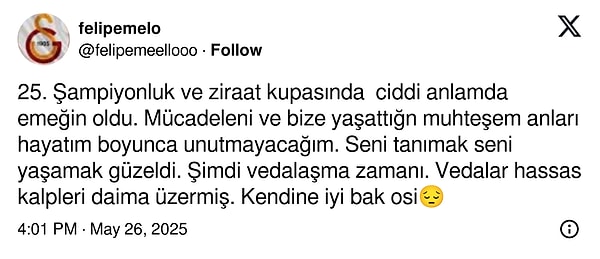 Galatasaray’da hem idarenin hem de taraftarın kadroda kalması için büyük efor sarf ettiği Victor Osimhen adım adım Suudi Arabistan’a gidiyor üzere. Al Hilal yıldız oyuncunun formasını resmi internette satışa sunup çok kısa bir mühlet içinde atağını geri alırken 26 yaşındaki forvet de Instagram hesabından ‘Before I Go / Ben gitmeden önce’ müziğiyle paylaşım yaptı. Sarı-kırmızılılar, toplumsal medyada bu durumu ‘veda’ olarak yorumlarken biraz da sitem etti.
