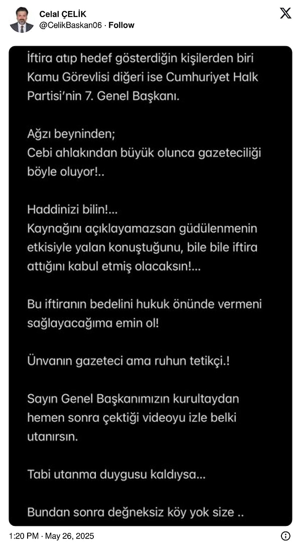 CHP’deki kurultay iptali davası tekrar siyaset gündemine düştü. Kongrede usülsüzlük olduğu nedeniyle açılan davada eski genel lider Kemal Kılıçdaroğlu’nun hali ve söyleyecekleri ise merak ediliyordu. Geçtiğimiz gün Nevşin Mengü’nün ortaya attığı argüman Kemal Kılıçdaroğlu’na yakın isimleri sinirlendirdi. Uğur Dündar’ın Nevşin Mengü’ye sahip çıkmasının akabinde gazeteci Celal Eren Çelik’in yaptığı paylaşım reaksiyon çekti. Mengü o paylaşıma isyan etti.