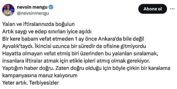 @DipDalgaHareket davet etmişti.Ofiste o esnada bulunan Kocaeli Üniversitesi’nde misyonlu bir akademisyen hocamız “Nevşin Hanım da bize medya dayanağı sağlar ise bu iş olur” dediğinde merhum Şahin Mengü “Nevşin mi? Aman uzak dursun,o aldığı fonlardan ötürü bu türlü Kemalist bir hareketi ağzına dahi alamaz” deyip acı acı gülmüştü.Evet Şahin Mengü, Ecevit periyodundan bu yana ölene kadar CHP’nin en Kemalist ve Atatürkçü isimlerinden biri olmuş, 1980 askeri darbesi sonrasında merhum Ecevit mahkemelerde yalnız başına bırakılırken yanında avukatlığını yapmış çok değerli bir isimdi.Ancak bu defa seninle ayrışıyorum;Nevşin Mengü “Babasının kızı” olmak şöyle dursun, merhum babasının “Siyasi davasına ziyan vereceğini düşündüğü için uzak durmasını” istediği bir karakterdir.Nevşin Mengü AB foncucusudur, belediye foncusudur ve kalemini de kelamını da buna nazaran oynatır.